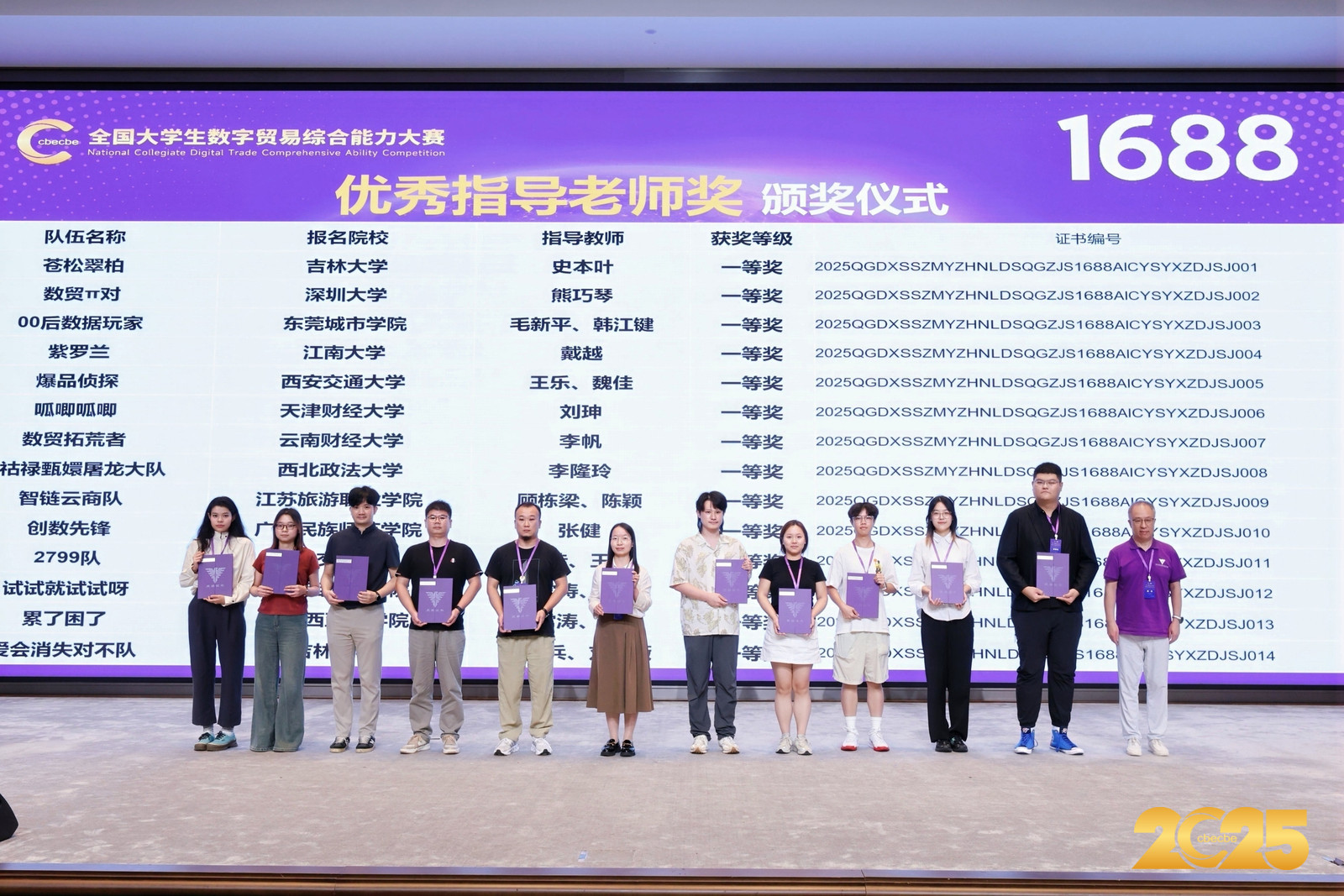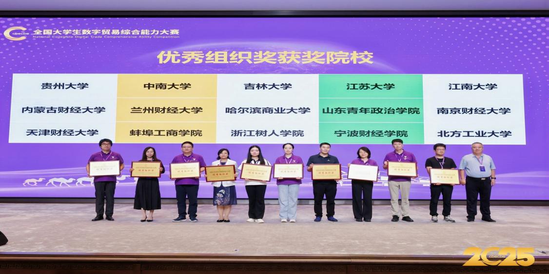 2025年9月28日上午,第四届全国大学生数字贸易综合能力大赛全国总决赛颁奖典礼在浙江大学紫金港校区图书馆报告厅举行,我院参赛团队延续了往届的优异表现,凭借扎实的专业功底与突出的实践能力,在比赛中表现出色,取得了总决赛一等奖2项、三等奖1项和全员获奖的优异成绩,丁一兵、史本叶、刘紫薇三位老师获得“优秀指导教师奖”,吉林大学经济学院再次获得“优秀组织奖”。