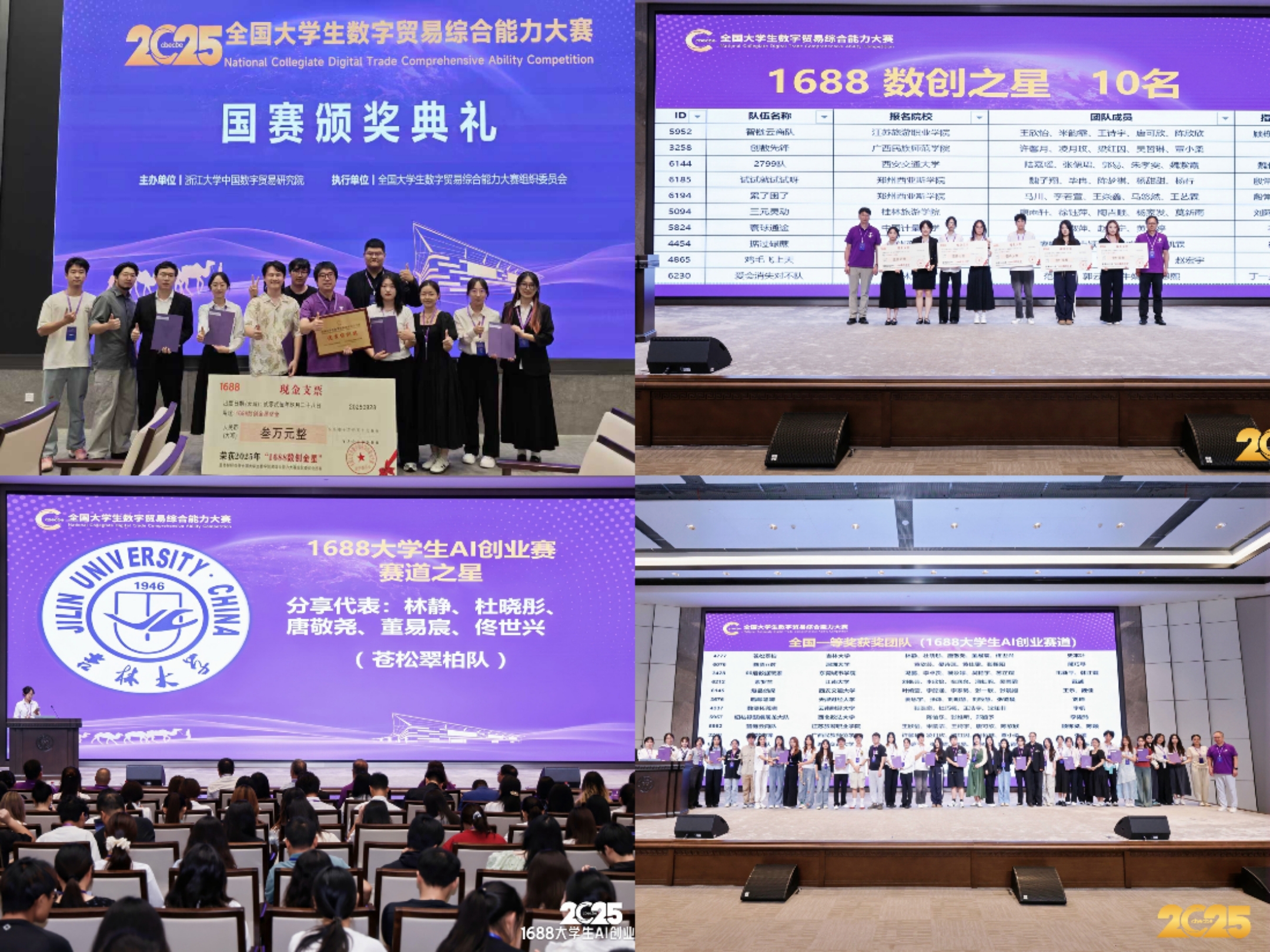 本届大赛紧跟数字贸易领域前沿趋势,全面考察参赛者在跨境电商、数字营销、数据分析等方面的综合能力。我院学子在初赛、区域赛和全国总决赛三个阶段中均展现了出色的团队协作精神与解决实际问题的能力,其成果获得了评委的认可,其中“苍松翠柏队”(林静、杜晓彤、董易宸、佟世兴、唐敬尧)被评为“1688AI创业金星”,“爱会消失对不队”(范瀚月、郭云洋、牛婧、栾恩熙)被评为“1688AI创业之星”。这份荣誉,不仅是对同学们辛勤付出的回报,也是对我院相关专业教学与实践培养成果的又一次肯定。