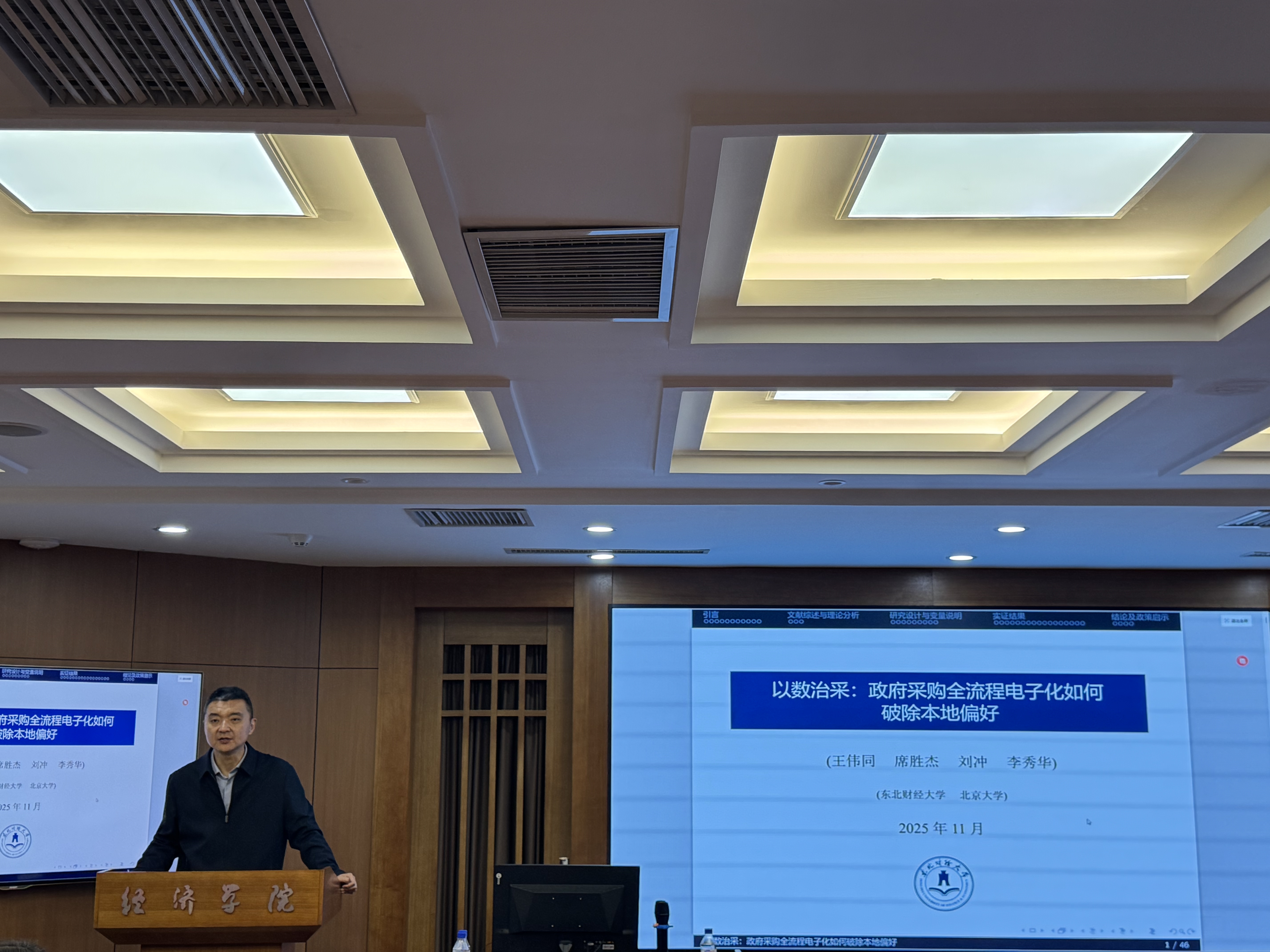 11月21日,国家级领军人才、东北财经大学副校长王伟同教授应邀来我校作题为“以数治采:政府采购全流程电子化如何破除本地偏好”的学术报告。报告由经济学院院长丁一兵教授主持,丁一兵院长代表吉林大学经济学院欢迎王伟同教授来吉林大学开展学术交流,并就王伟同教授的研究成果及其影响进行了简要介绍。学院部分中青年教师、研究生近百人参加了此次讲座。