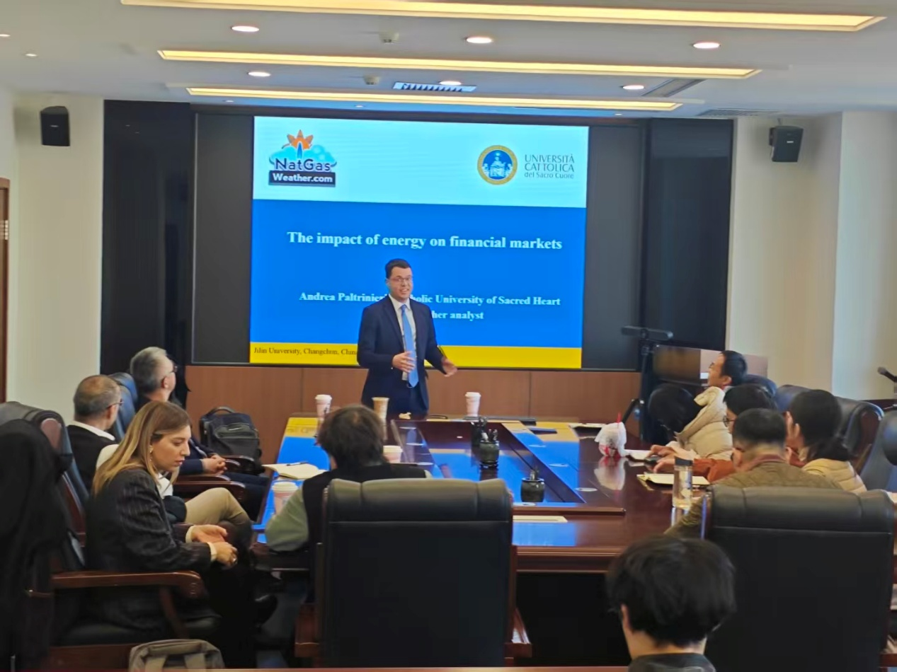 首先,邵学峰教授对Paltrinieri副教授的到来表示热烈欢迎,随后王皓教授介绍了他在能源经济与国际金融领域丰富的实务经验与深厚的学术造诣。讲座伊始,Paltrinieri副教授介绍了全球能源市场与金融市场的情况,结合对天然气等能源市场的分析,系统阐述了能源市场与金融市场之间的联动机制与传导路径。他结合现实市场情况与实证分析,对能源市场价格波动等如何影响资产定价、风险情绪及金融机构行为进行了深入剖析。随后,Paltrinieri副教授就其主要研究发现进行了阐述,主要有能源商品作为一种重要的金融资产和大类资产配置组成部分,其价格波动对股票、债券等传统金融市场具有显著的外溢效应;地缘政治、气候变化等外部冲击通过能源渠道对金融稳定构成潜在风险,并分享了相关的实证研究证据;针对如何应对和管理能源风险,他也提出了一些前瞻性的政策思考和市场实践建议。