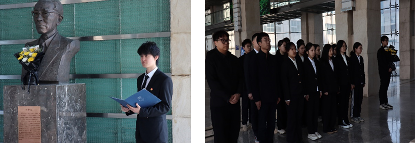 在王海宇同学的有序组织下,2024级本科生郭越同学缓步上前,以真挚饱满的情感,深情回顾关梦觉先生的生平经历与学术贡献。关梦觉先生潜心钻研政治经济学与世界经济,治学严谨、笔耕不辍,为我国经济理论研究与学院经济学科的奠基发展倾注心血。致辞完毕,学生代表尹泽阳同学手捧鲜花,缓步上前,郑重地将鲜花敬献于关梦觉前辈铜像前,以鲜花托哀思,以敬意悼念先贤,参加活动的师生向关梦觉先生铜像行三鞠躬礼。