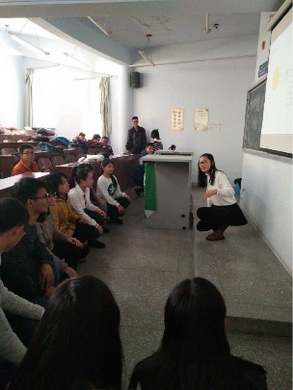 下一个环节是王双讲说礼仪知识。她以蹲姿为主要讲说内容。首先,王双总述了蹲姿的要求,下蹲时要自然,得体,大方;头部,胸部,膝关节在同一直线上。紧接着她讲了三种蹲姿,高低式,半跪式,交叉式。高低式和半跪式男士女士均可采用,交叉式则多用于女士,并且很适合在穿短裙时采用。她以让同学们一起实践的方法来加深大家对蹲姿的印象。在欢笑中大家学会了优雅的蹲姿。
