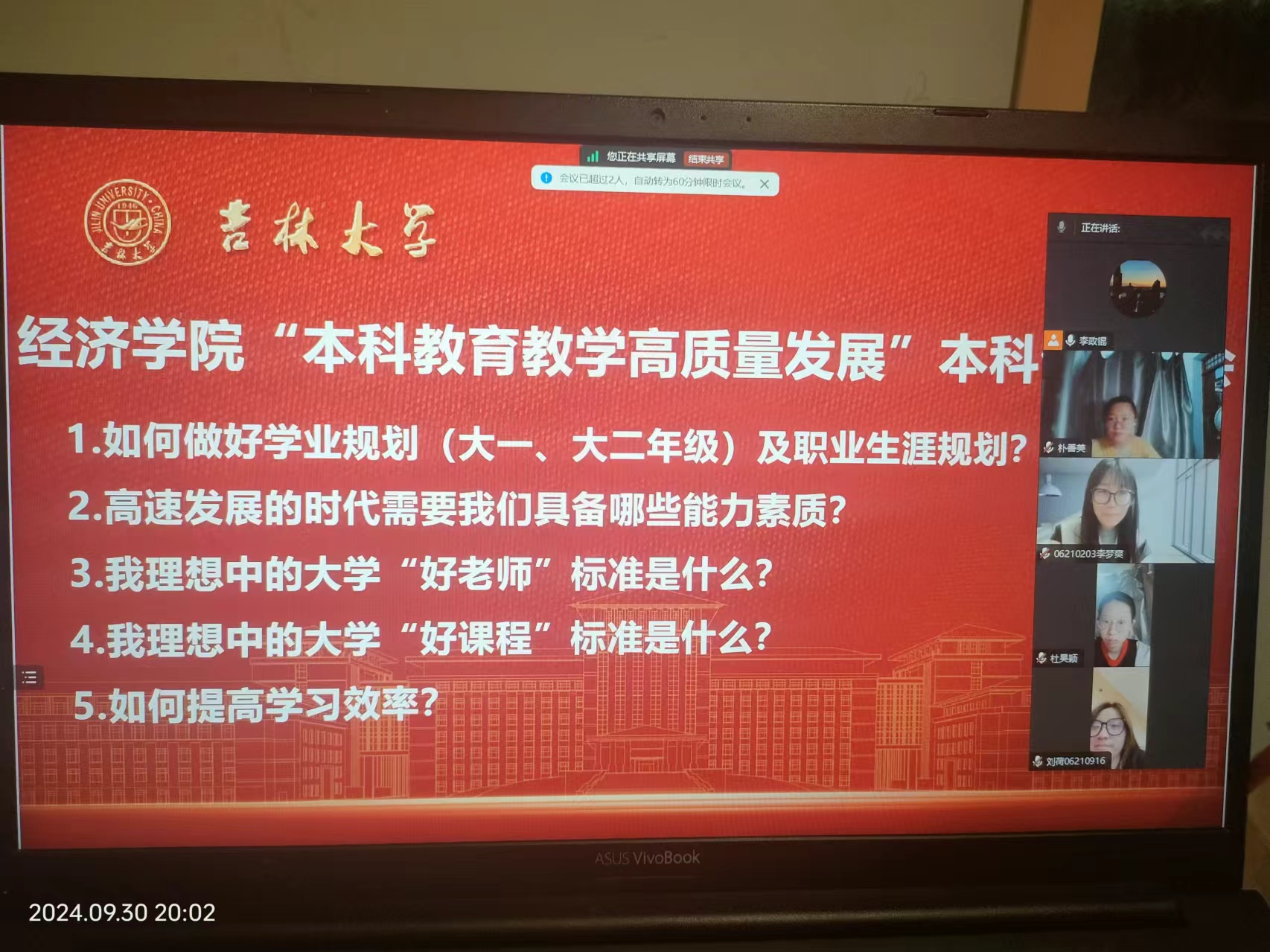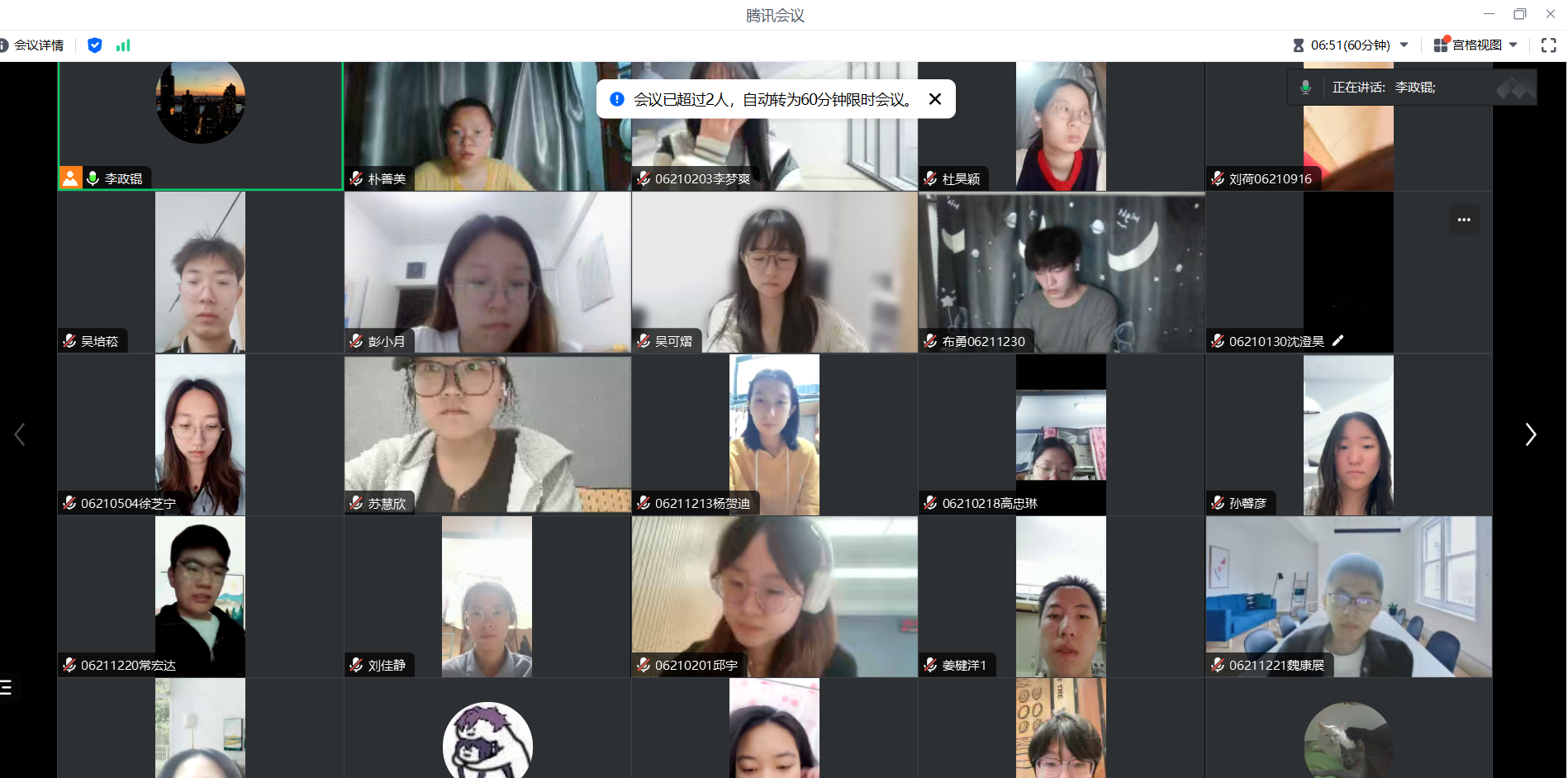 为了帮助同学们提高自我规划意识,交流学业和职业规划经验,2021级经济系21、22、23班于9月30日线上组织了“追梦年华,青春无悔”主题班会。班会由学委李政锟同学主持,经济系全体同学参加了本次班会。