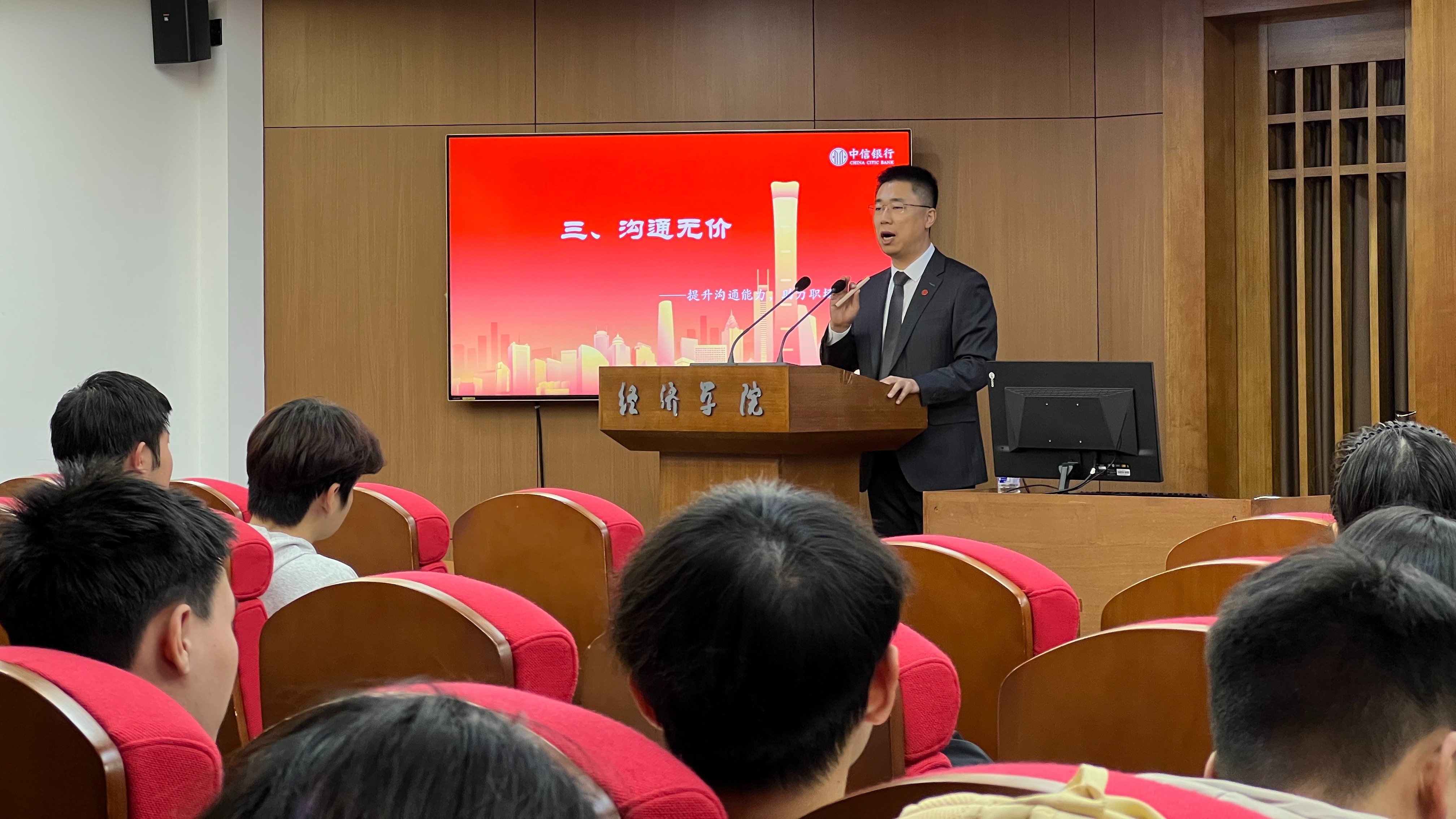 首先,朱永君校友结合真实案例,剖析金融风险与电信诈骗的常见手段,提醒同学们警惕兼职刷单、冒充客服等校园高发骗局,强调“信息不透露、转账要核实”的防范原则。其次,他聚焦征信体系的重要性,指出在现代金融社会中,个人征信如同“经济身份证”,不良记录将影响贷款、就业等关键领域,呼吁同学们珍视信用记录,树立理性消费观。最后,他分享职场沟通技巧,通过自身经历讲解与上下级、平级同事及客户沟通的策略,强调“换位思考”“有效倾听”在化解矛盾、提升效率中的核心作用。