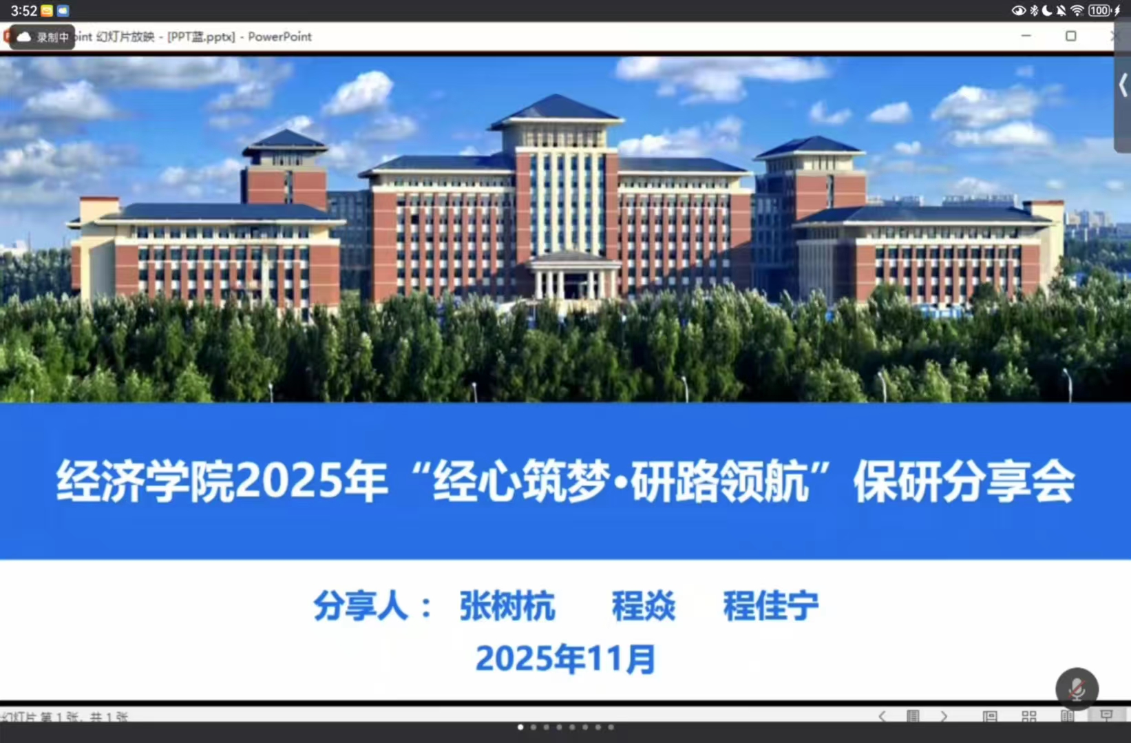 2025年11月26日上午,经济学院2025年“经心筑梦·研路领航”保研分享会以线上腾讯会议形式顺利举行。活动由2023级辅导员邹雨彤主持,2022级张树杭、程焱、程佳宁三位同学受邀担任主讲嘉宾,结合自身保研经历,为参会学子提供了兼具针对性与实用性的经验分享与指导建议。