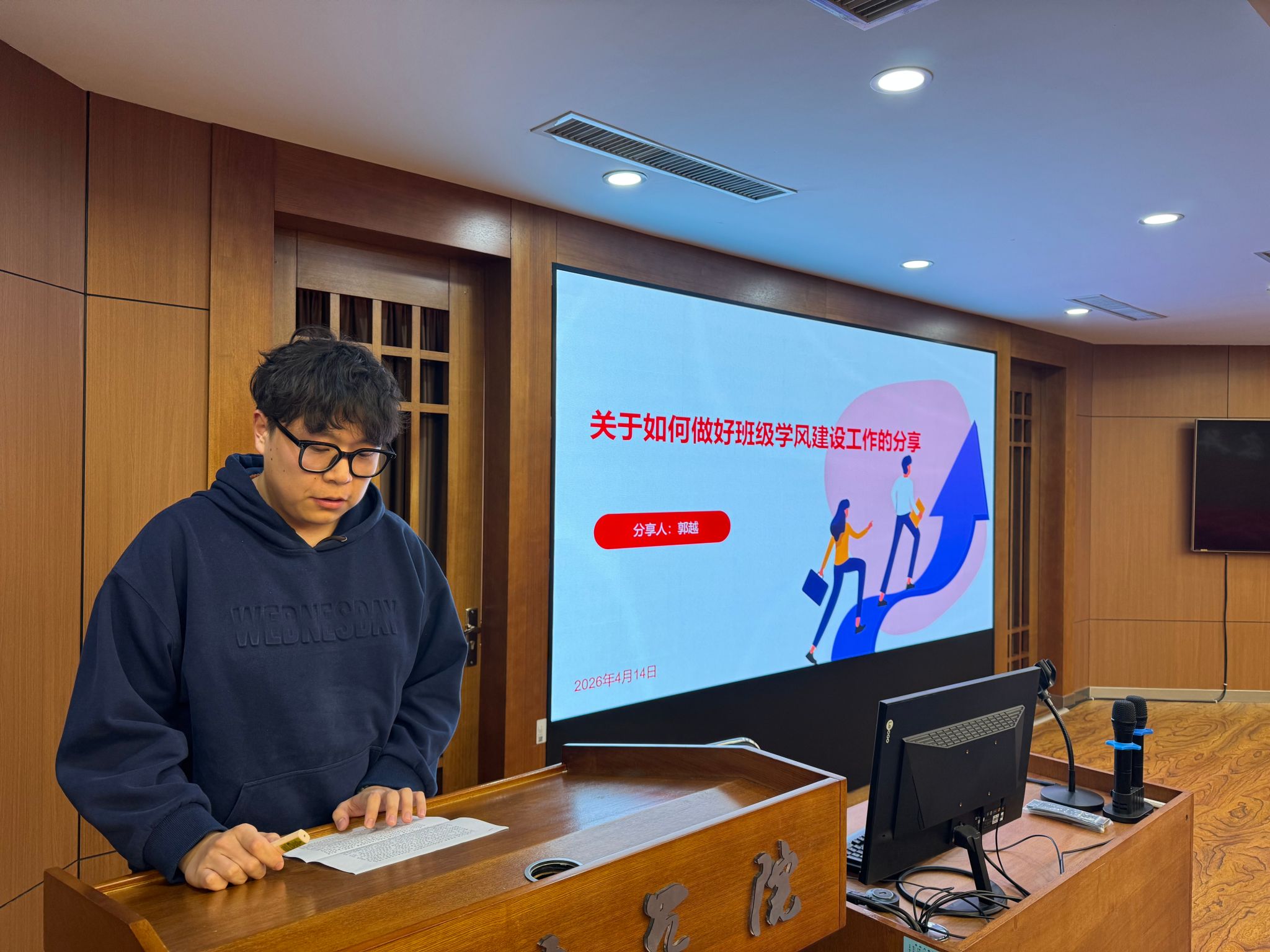 年级学习委员郭越结合本学期课程难度加大、部分学生学习动力不足的现状,作《关于班级学风建设的思考与实践》专题报告。他强调,学风建设是班级发展基石,需构建系统化治理体系,建立班委“信息互通”机制、“寝室-班级”联动监督网和“学委+班支+心理委员”协调联动机制,针对学业预警同学开展多维度干预,并预告了“一对一学伴”招募计划,号召各班凝聚优秀力量,营造互帮互助的优良学风。