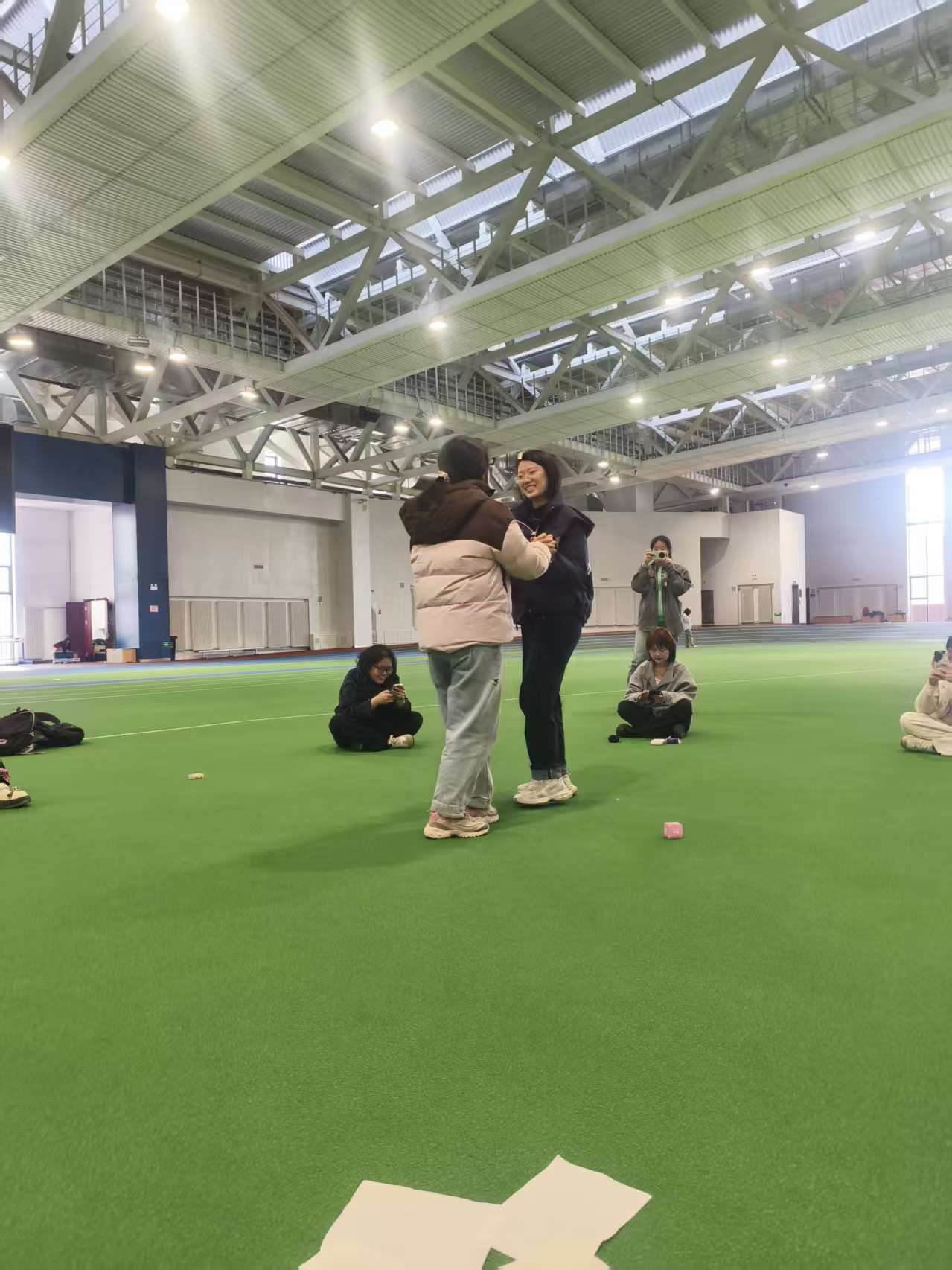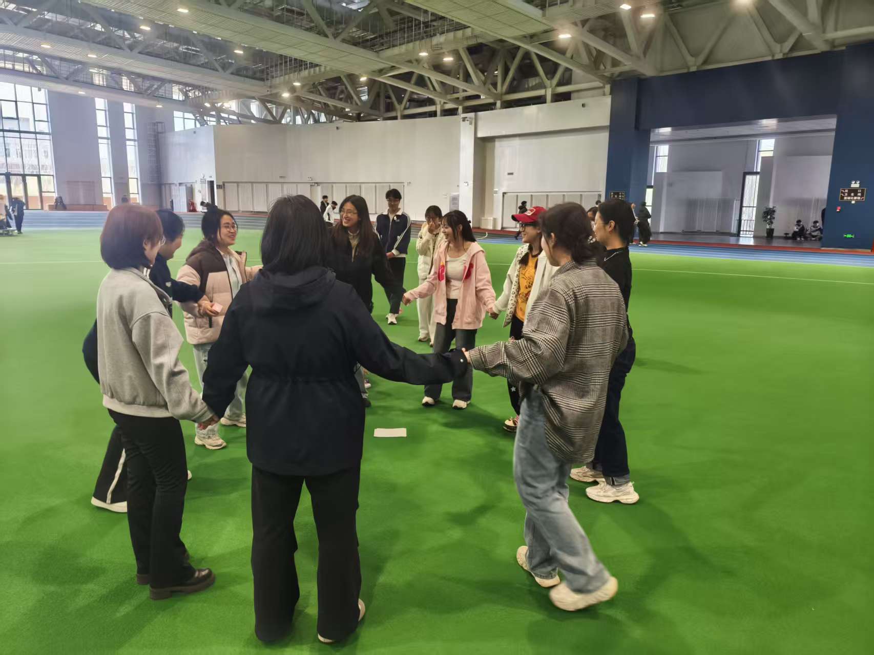 活动伊始,“击鼓传花”环节迅速打破拘谨氛围。随着音乐起落,玩偶在同学们手中快速传递,传递中断时,同学即兴展示才艺或完成绕口令、深蹲等小惩罚,现场氛围快速升温,实现高效“破冰”。随后开展的“丢手绢”活动中,同学们围坐成圈、奔跑互动,尽情释放青春活力。