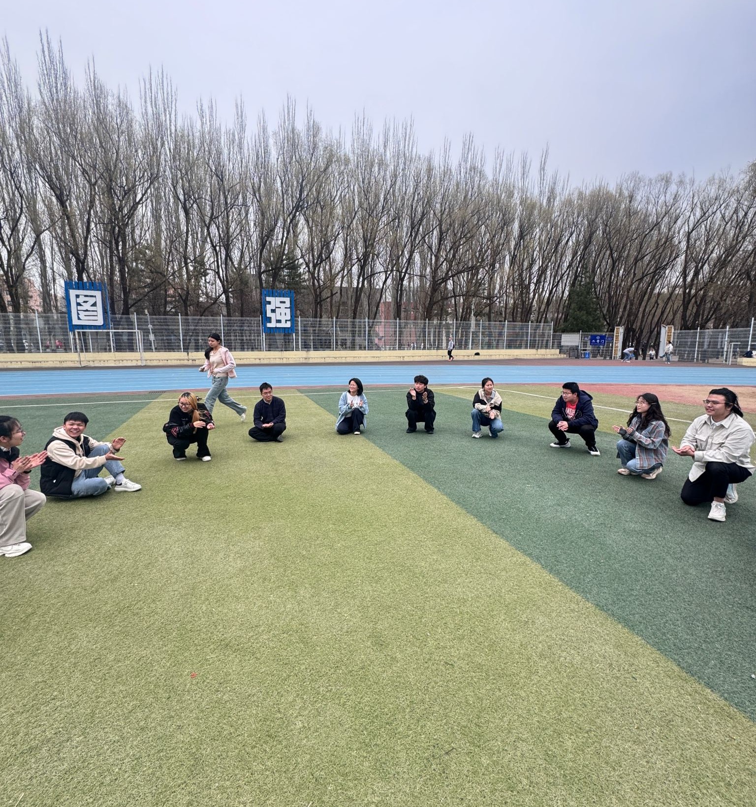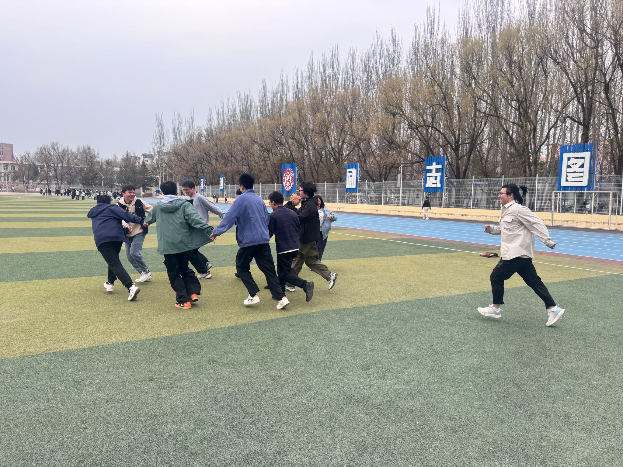 当日田径场气候适宜,同学们提前到场准备,经简单热身和规则讲解后,趣味运动会正式开始,三个互动游戏依次开展。“荆轲刺秦”考验团队默契与反应速度,同学们协作防守、灵活抓捕,现场氛围热烈;“沙漠里有几只猴”锻炼注意力,节奏渐快的比拼中,失误与欢笑并存,有效打破同学间拘谨;“逛三园”游戏中,大家围绕多样主题对答,在思维碰撞中加深了解。