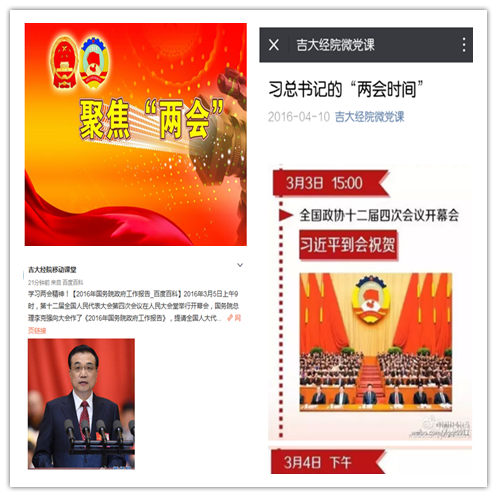 为进一步推动党员的思想教育,强化党员宗旨意识,活跃党支部组织生活,弘扬社会主义核心价值观,按照《关于开展吉林大学2015年“党员先锋工程”本(专)科学生党支部建设活动立项工作的通知》的要求,经济学院2014级本科生党支部积极、认真实施“新媒体,微平台,党课宣传移动化”项目,于近期在“吉大经院移动课堂”微博、“吉大经院微党课”微信公众号等平台上推送2016全国两会资讯。2016年全国两会,即中华人民共和国第十二届全国人民代表大会第四次会议和中国人民政治协商会议第十二届全国委员会第四次会议,分别于2016年3月5日和3月3日在北京举行。为深入贯彻两会精神,推动党员思想教育,经济学院2014级本科生党支部在“吉大经院移动课堂”微博、“吉大经院微党课”微信公众号中整理各类两会系列报道,包括2016年国务院政府工作报告、两会十大经济热点解读、2016两会民生热点问题解析、优秀媒体社评等,以方便师生党员查阅学习。