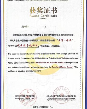 2025年9月28日,第四届全国大学生数字贸易综合能力大赛总决赛在浙江大学圆满落幕。史本叶教授所指导的研究生队伍历经初赛、区域赛的层层严苛选拔,在长达五个月的刻苦备战与激烈角逐后,最终在全国总决赛的舞台上凭借卓越表现,荣获“2025第四届全国大学生数字贸易综合能力大赛——数字贸易大数据分析赛道”全国一等奖,同时获得“1688AI创业金星”称号,史本叶教授也再次荣获“优秀指导教师奖”